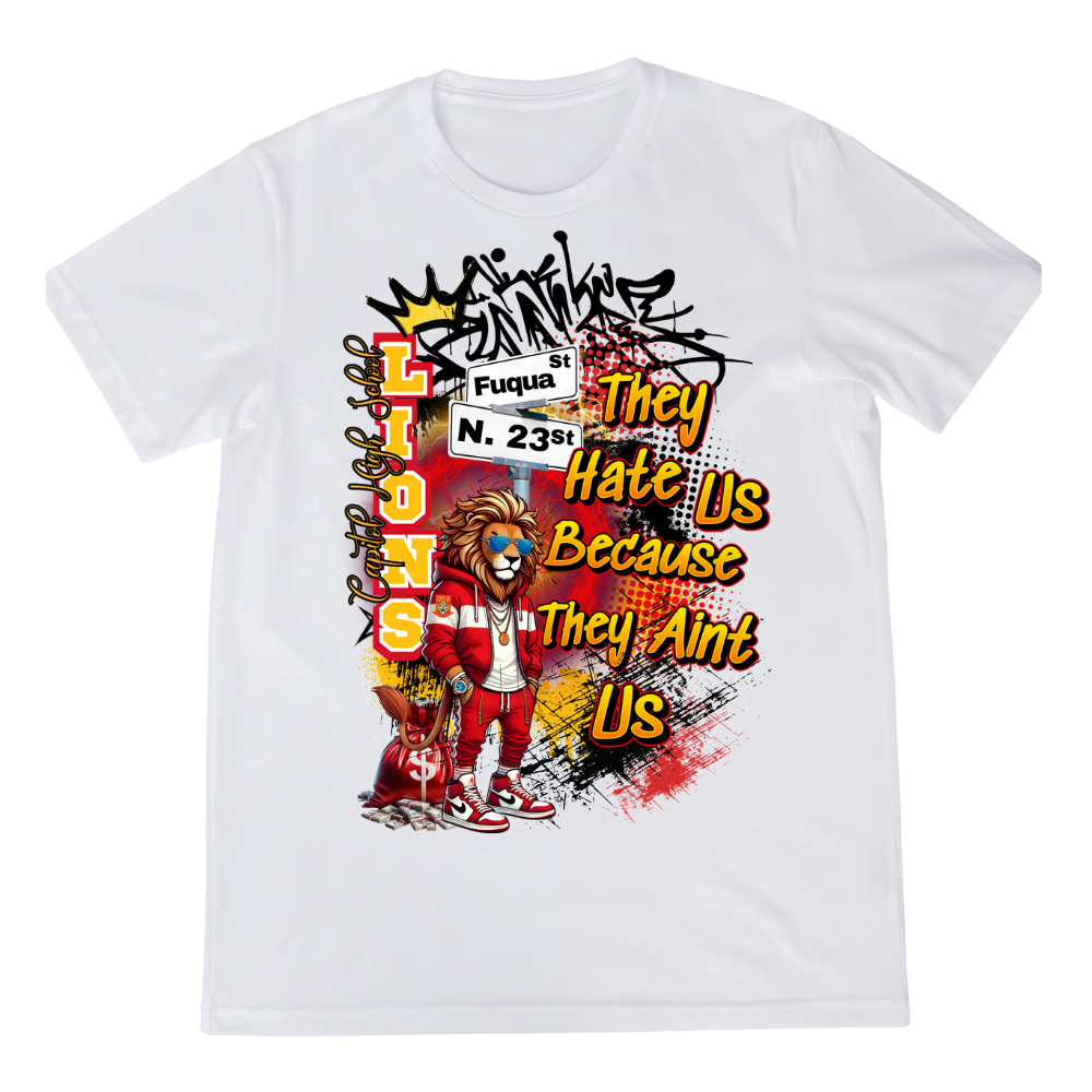 Embrace your Capitol High School pride with this bold and stylish "They Hate Us Because They Ain't Us" T-shirt. Perfect for students, alumni, and fans, this tee features a unique design that celebrates your school spirit with attitude and flair. Wear it to games, on campus, or during casual outings to let everyone know that the Lions are unmatched.