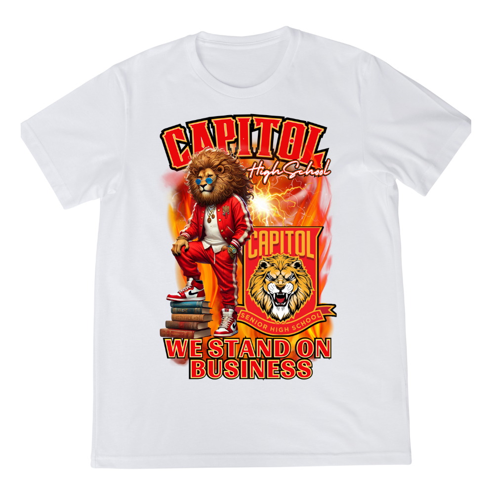 Exude your Capitol High School pride with this standout "We Stand On Business" T-shirt. Perfect for students, alumni, and fans, this tee embodies the spirit of determination and excellence that Capitol High is known for. Wear it to games, school events, or casual outings to let everyone know that you represent the best.